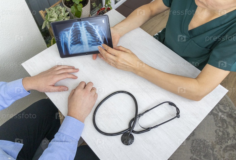 Стреляно женщиной-врачом в форме, показывающей рентгеновское изображение легких на таблетке для пациента