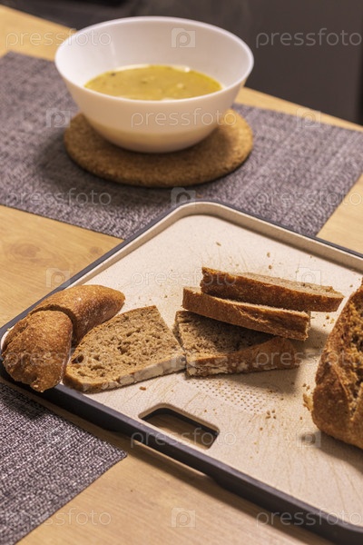 Чаша супа, свежевыпеченная и нарезанный домашний хлеб на столешнице кухни