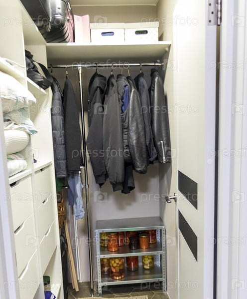 Обнаженная комната с одеждой, оцинкованные стальные полки с банкой с различными видами укропов и консервов на ней