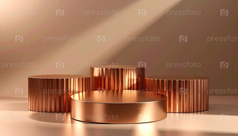Абстрактный медный подиум, освещенный теплым светом, представляет собой роскошный дизайн современной презентации и элегантную концепцию минимализма