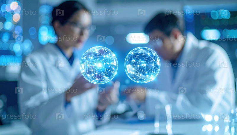 Ученые в футуристической лаборатории анализируют цифровые молекулярные сферы, символизирующие инновации, искусственный интеллект и научные открытия