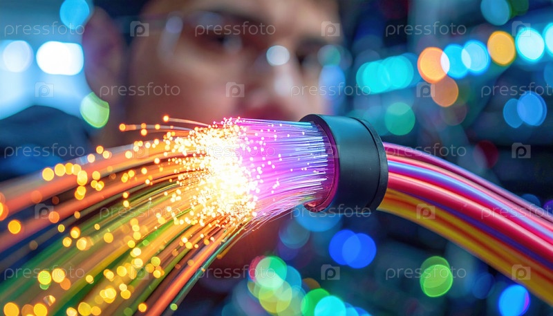 Закрытие волоконно-оптических кабелей, светящихся красочным светом, символизирующих высокоскоростной Интернет, подключение, современные коммуникационные сети и технологии передачи данных
