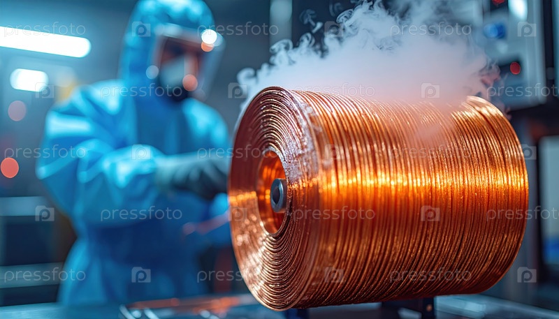 Ученый, работающий с медным катушкой, излучающей пар в лабораторной среде, представляющей собой сверхпроводность, энергоэффективность и исследование передовых материалов
