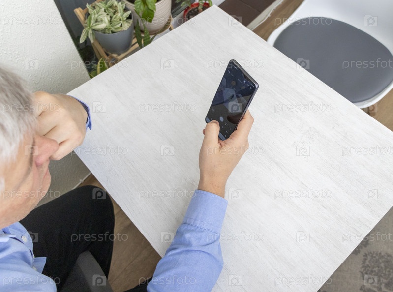 Мужчина средних лет сидит за столом и пользуется телефоном