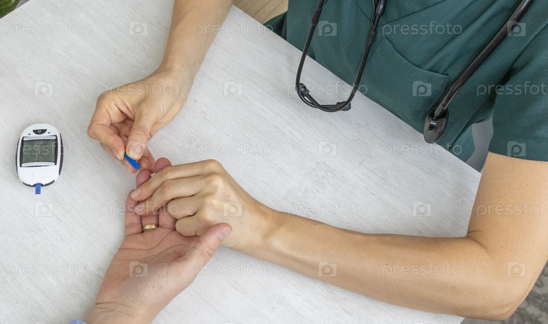 Руки женщины-врача в форме, которая измеряет уровень сахара в крови пациента