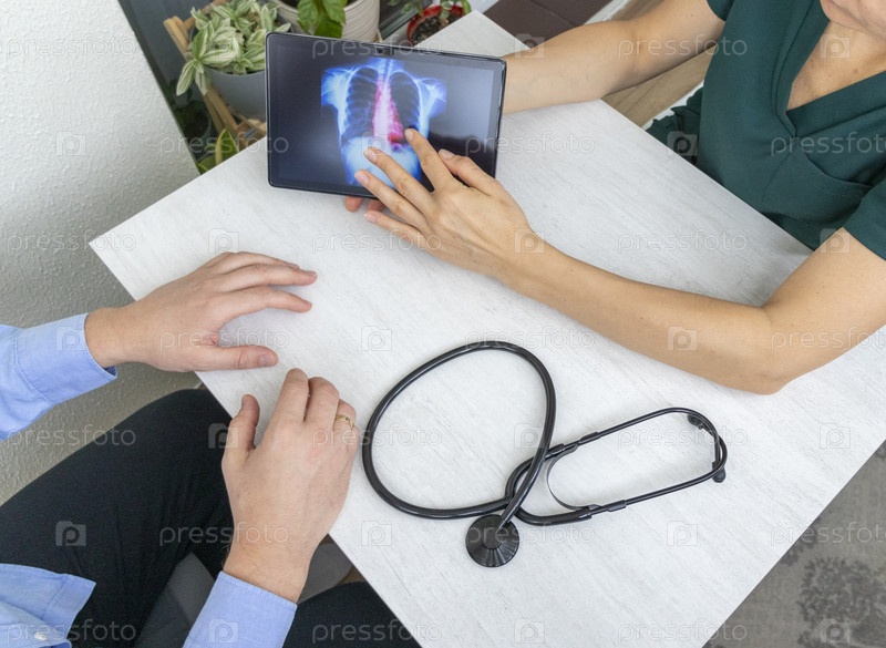 Руки женщины-врача в форме, показывающие рентгеновское изображение легких на таблетке для пациента
