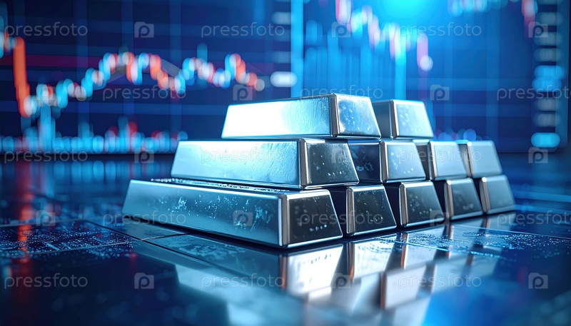 Серебряные слитки, складываемые в соответствии с графиком рынка, иллюстрируют финансовую безопасность, инвестиции и экономическую стабильность в мировой торговле и тенденциях в драгоценных металлах