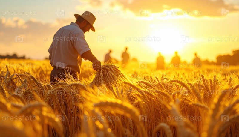 Фермер, собирающий пшеницу при золотом закате солнца, символизирует сельское хозяйство, тяжелый труд, устойчивость и благодарность за сезон урожая и сельскую жизнь