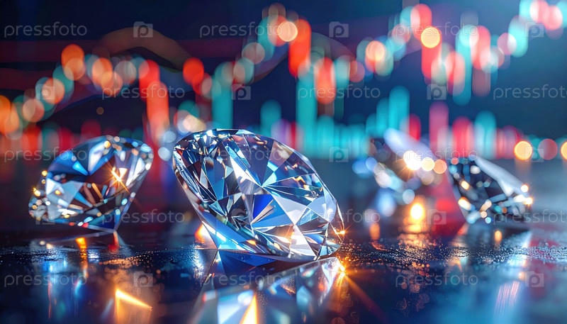 Блестящие бриллианты на отражающей поверхности символизируют роскошь богатства и тенденции финансовых рынков с концепцией стоимостных инвестиций и глобальной экономики