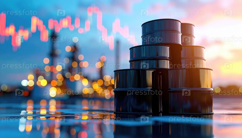 Баррели с нефтью, наложенные лампами нефтеперерабатывающих заводов, символизируют энергетическую отрасль, мировую экономику и колебания рынка сырой нефти вечером