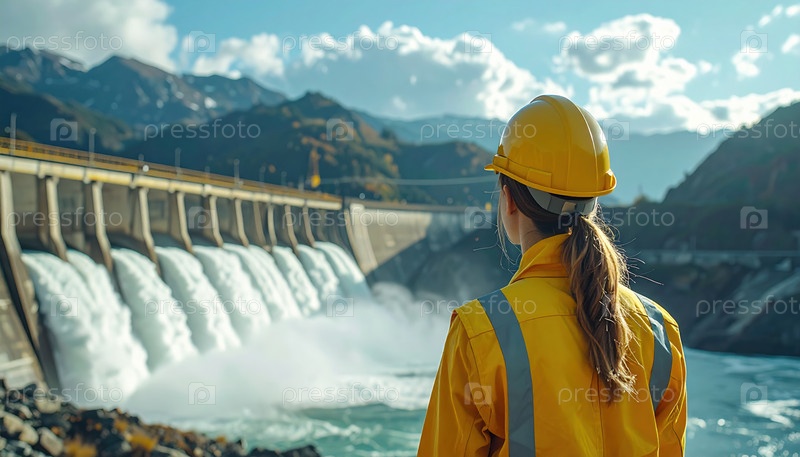 Инженерка в желтом защитном снаряжении осматривает гидроэлектростанцию, окруженную горами, представляя возобновляемые источники энергии и устойчивость