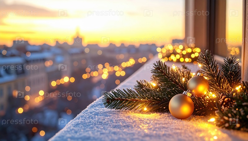 Рождественское украшение с золотыми орнаментами и сказочными огнями на снежном балконе при закате солнца, символизирующие тепло, мир и зимние каникулы