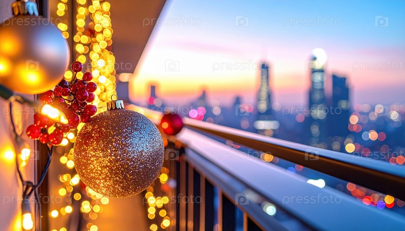Городской балкон украшен рождественскими декорациями на закате, символизирующими праздничный дух, городские каникулы и красоту праздничных огней в современных горизонтах