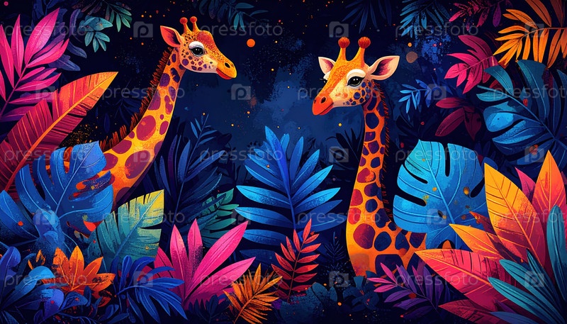 Яркая иллюстрация двух жирафов в красочном джунглях, представляющая творчество воображения и искусство дикой природы, сливая фантазию с естественной красотой