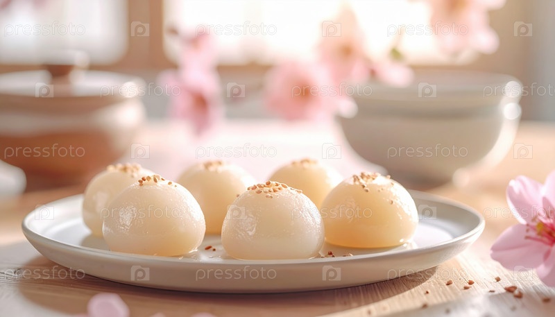Традиционный японский десерт из мочи подается на тарелке с вишневыми цветами, отмечая весну и культурную гармонию японской чайной церемонии и сладость жизни