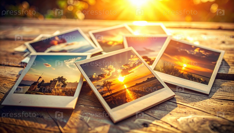 Рассеянные ностальгические фотографии путешествий, захватывающие воспоминания о закате солнца на деревенском деревянном столе, символизируют ностальгию и страсть к странствованию