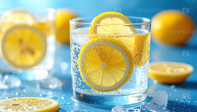 Стакан газированной воды с лимонными ломтиками под ярким солнечным светом, символизирующий свежесть, оздоровительный образ жизни и глобальную тенденцию к гидратации и здоровым привычкам
