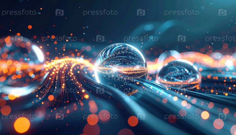 Футуристическая визуализация передачи данных через светящиеся сферы на цифровых путях, символизирующие технологическую связь и скорость в современных коммуникационных сетях