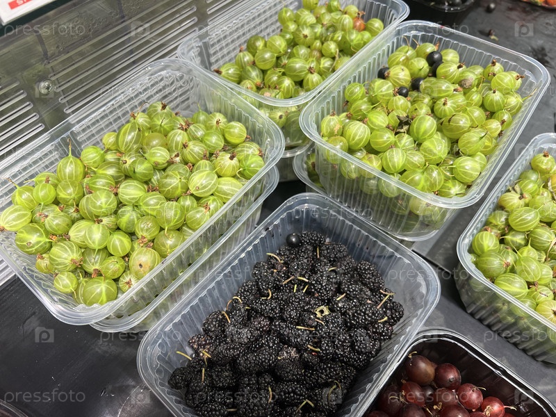 Свежесобранные ягоды и груша выставляются в прозрачных контейнерах на рынке