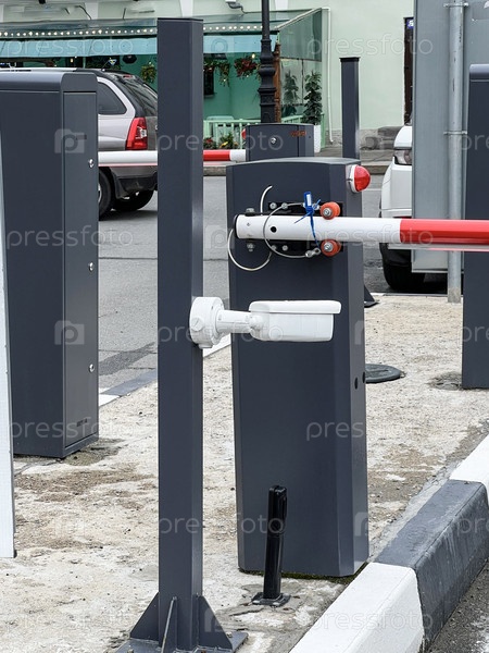 Современный дорожный барьер расположен у входа на парковочную конструкцию.Барьер имеет красно-белую ручку и блок управления.На заднем плане видны транспортные средства