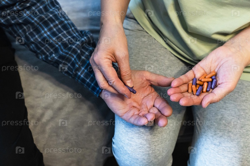 Руки обмениваются лекарствами во время медицинского осмотра в уютной гостиной