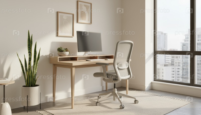 Минималистский интерьер домашнего офиса с естественным светом, современной мебелью и уютной эстетикой, представляющей производительность, баланс и тенденцию удаленного образа жизни в городских квартирах