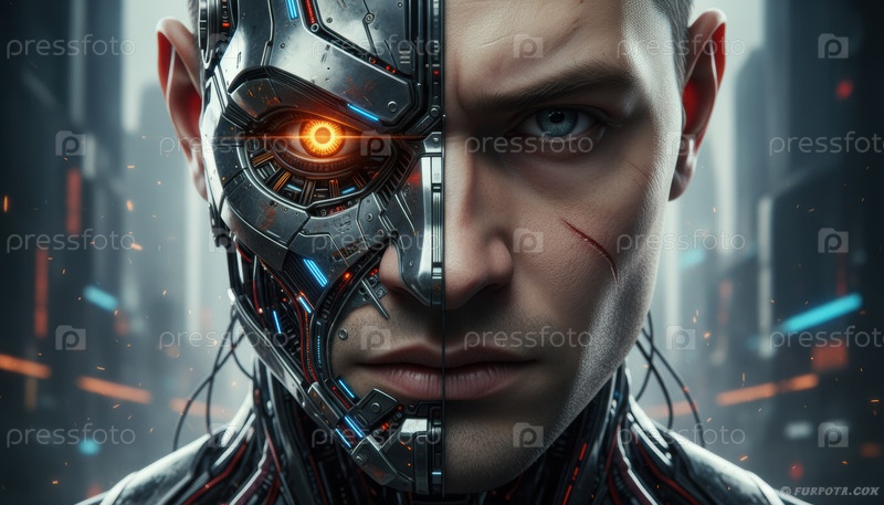 Футуристический получеловеческий полукиборг, представляющий эволюцию искусственного интеллекта, интеграцию технологий, этику трансгуманизма и слияние человека и машины в будущем