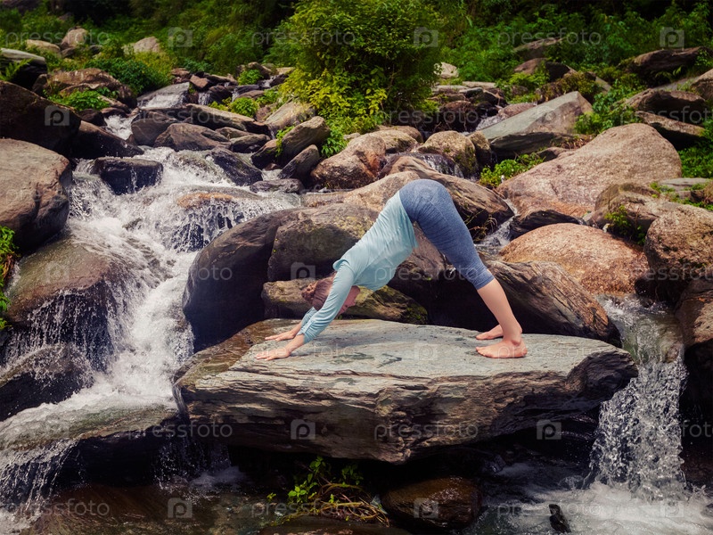 Молодая спортсменка выполняет асану йоги Adho mukha svanasana - собаку, обращенную вниз к тропическому водопаду