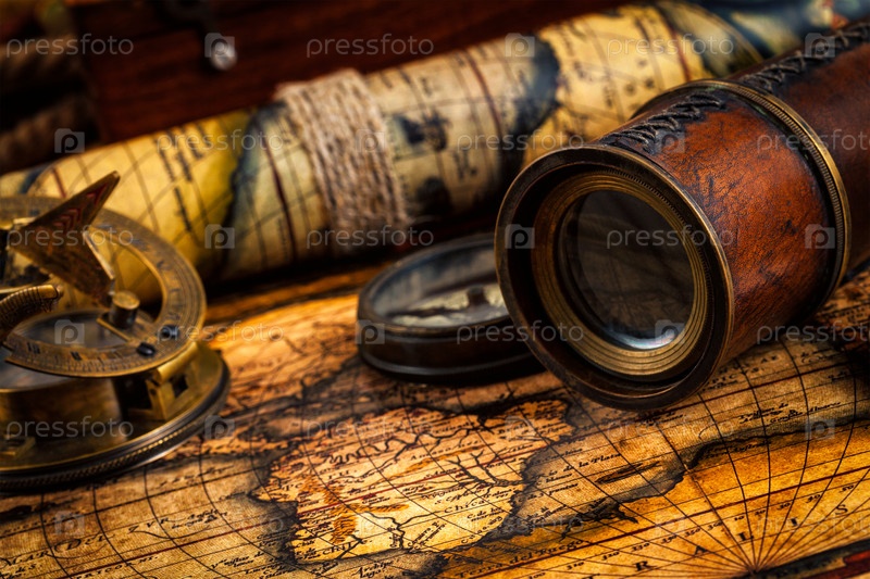 Древний компас и навигационные инструменты на древней карте