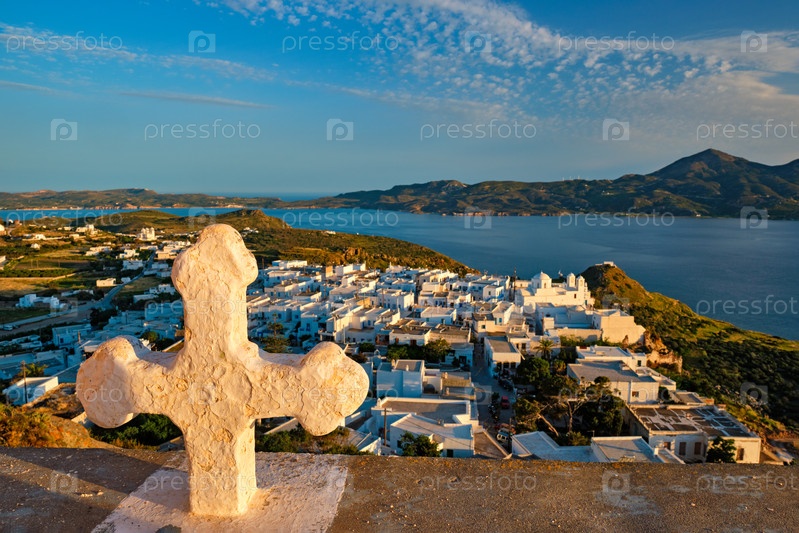 Греко-православная христианская концепция фона представляет собой христианский крест с деревней Плака на острове Милос в фоне при закате солнца