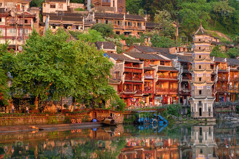 туристическая достопримечательность - Древний китайский город Фэньхуань (Древний город Финикс) на реке Тяо Цзян с башней пагоды Ванмин при закате. провинция Хунань, Китай