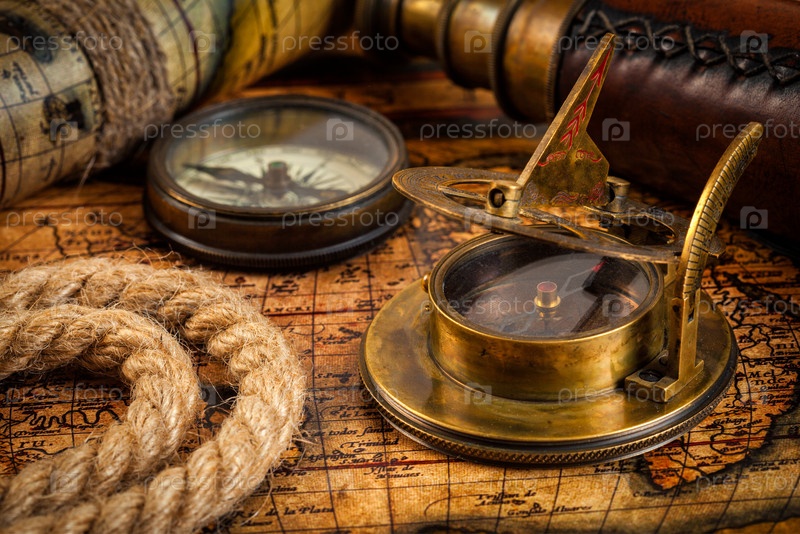 Концепция навигации по географии путешествий - это старый винтажный ретро-компас с солнечными часами, шпионским стеклом и веревкой на карте древнего мира
