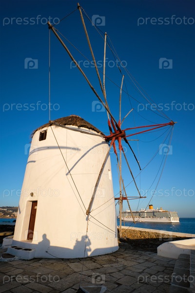 Традиционные греческие ветряные мельницы на острове Миконос на рассвете с круизным кораблем на заднем плане, Киклады, Греция