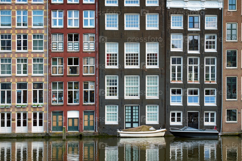 Серия типичных домов и лодка на Амстердамском канале Дамрак с отражением