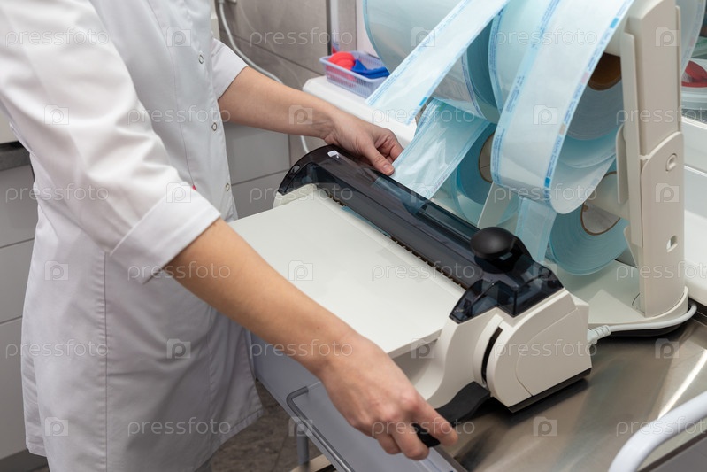 Стоматологический помощник использует теплозащитную машину для упаковки инструментов