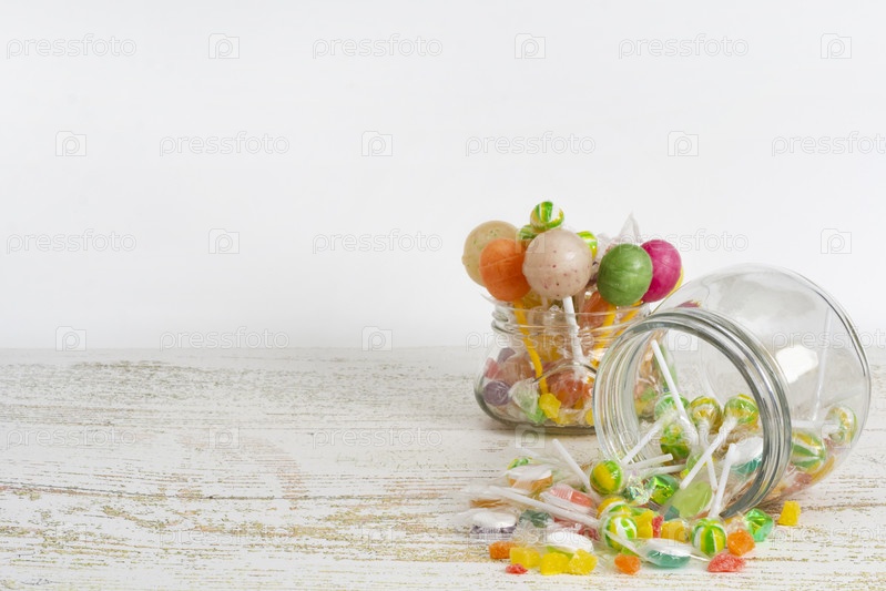 Цветные леденецы в стеклянных банках на деревянном фоне. Смотрите прямо вперед. Копируйте пробелы