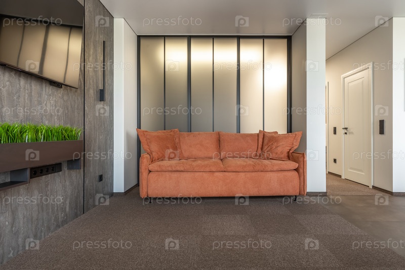 Современная гостиная с оранжевым диваном и стеклянной перегородкой