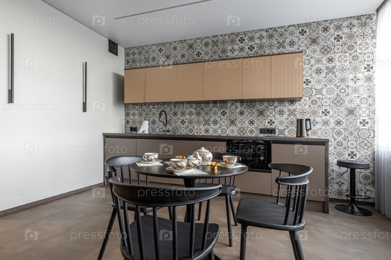 Элегантная современная кухня с рисунковыми плитками, бежевые шкафы, черные стулья и чайный комплект расположен на круглом столе
