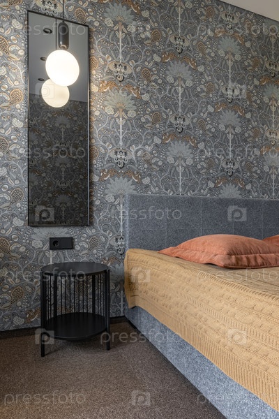 Стильный интерьер спальни с декоративными обоями, современным ночным столом, зеркалом на стене и мягкой кроватью с теплым одеялом