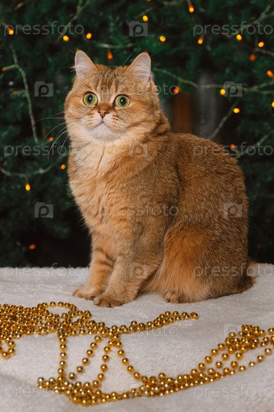 Красный британский кот в новогоднем украшении