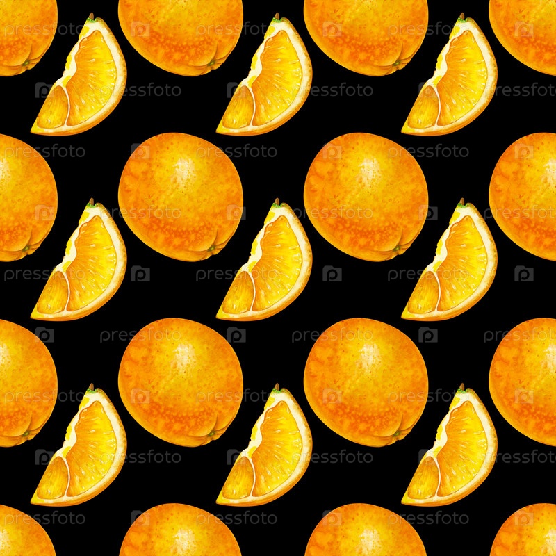 Бесшовный рисунок с апельсинами. Иллюстрация акварели на темном фоне. Ботанический бесшовный фон с яркими фруктами, целыми и кусками, для упаковки, обоев, текстиля