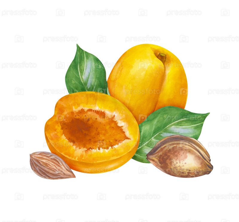 Акварельная композиция со зрелыми абрикосами, нарисованная вручную. Ботаническая иллюстрация с фруктами, зелеными листьями и ямами, изолированными на белом фоне. Для упаковки, обоев, текстиля и посуды