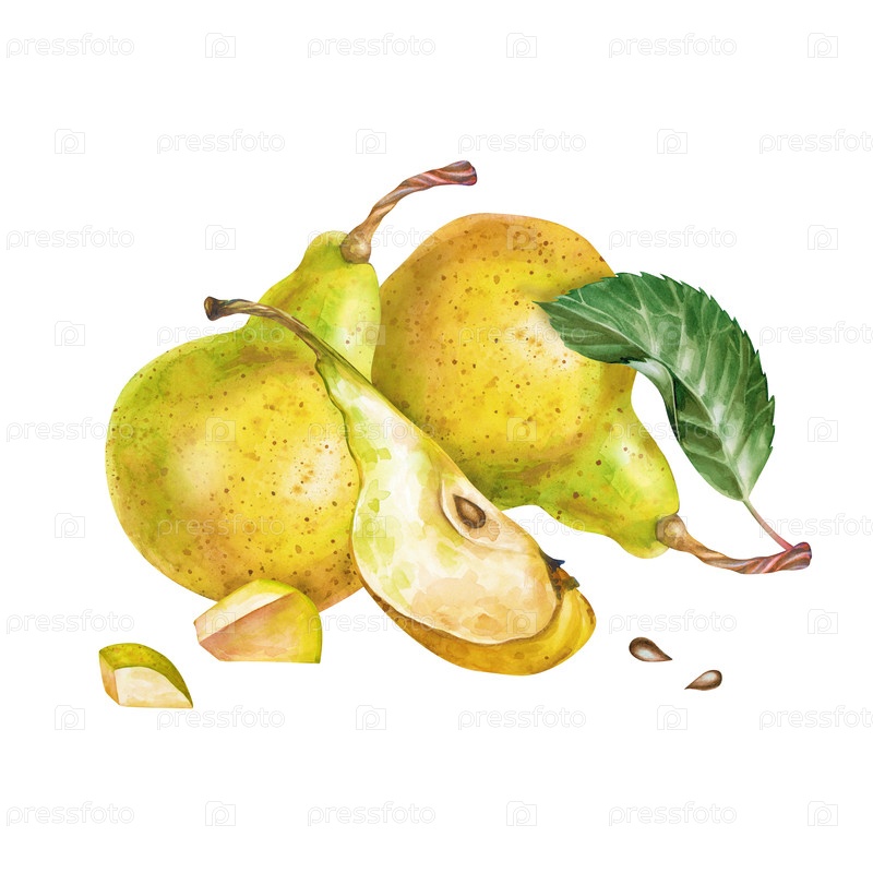 Акварельная композиция со зрелыми грушами, нарисованная вручную. Целые груши, ломтики, нарезанные куски и зеленый лист изолированы на белом фоне. Ботаническая иллюстрация с сезонными сочными фруктами для кулинарного блога, садоводства, косметических марок