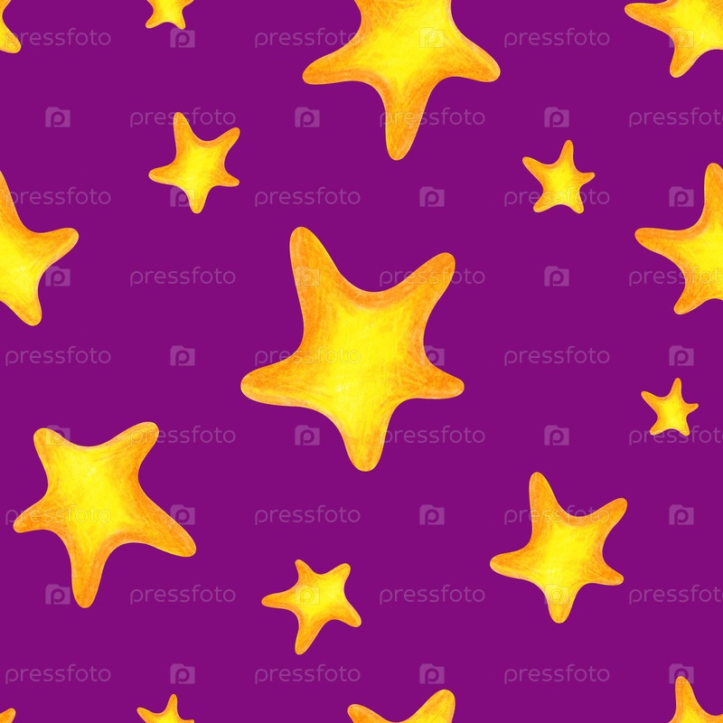Бесшовный узор с золотыми звездами на фиолетовом фоне, нарисованный карандашом. Иллюстрация цветными карандашами. Рисунок ребенка. Для текстиля, детской обои или упаковки