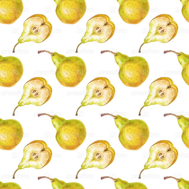 Бесшовный акварельный рисунок с желтыми грушами на белом фоне. Целые груши и половинки представляют собой ботанический бесшовный фон со сладкими целыми фруктами и половинками. Для упаковки, обоев, кухонного текстиля и посуды