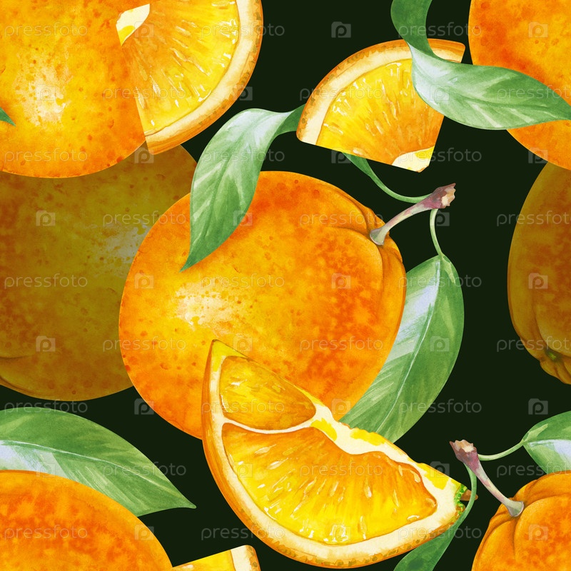 Акварель - это бесшовный рисунок с апельсинами, ломтиками и зелеными листьями на черном фоне. Иллюстрация с сочными фруктами нарисована вручную. Ботанический безшифровый шаблон для упаковки, текстиля, обоев и посуды