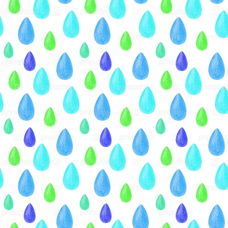 Бесшовный рисунок из голубых и зеленых капель, нарисованных вручную цветными карандашами. Оригинальный чертеж многоцветных капель дождя на белом фоне. бесшовный фон для обоев, упаковки, текстиля в детских комнатах