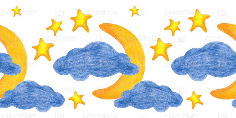Бесшовная граница с полумесяцем в облаках и ручным рисунком звезд. Рисунок цветными карандашами изолирован на белом фоне. Рисунок ребенка. Шаблон для текстиля, обоев и упаковки