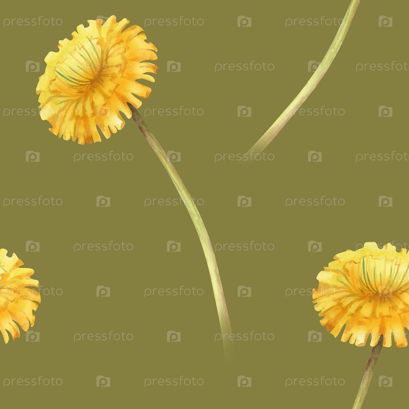 Акварельный бесшовный рисунок с желтыми цветами одуванчика на длинном стебле на зеленом фоне. ботанический шаблон для обоев, упаковки и текстиля
