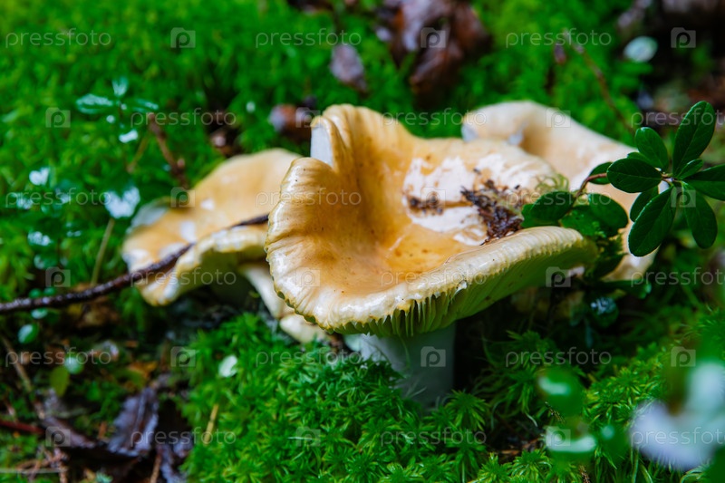 Желтый гриб сырый в лесном мохе